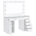 Boasting a Hollywood regency flair, this vanity offers a bold, clean-lined aesthetic for a contemporary home as it shows off a white finish throughout that opens itself up to your existing color palette. Keep all of your cosmetics and beauty products organized within the seven spacious drawers, displaying special items in the top three. Above the top row of drawers is a clear tempered glass top that showcases everything beneath. Each drawer is also adorned with a glimmering crystal-like acrylic knob. Lastly, the oversized vanity mirror offers all the glow you need, complete with eleven globe-style bulbs that lend a vintage vibe.