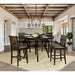 Flick Rustic Oak Counter Ht. Table, 43 3/8"L X 43 3/8"W X 36"H, 85.8lbs. Build yourself a small breakfast nook with this distinctly shaped counter height table. The brown cherry top features touches of warm red that are tied perfectly with gray leatherette upholstery. The chairs feature padded seating and small cushion on the backing for those extended morning chats. A small bottom shelf gives you the opportunity to display leafy plants or little mood setting knick knacks for your eating area. Features: Display Panel Table Base Curved Table Top Padded Leatherette Seat & Back