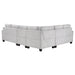 Ensure stylish seating for the whole family with a modern L-shaped sectional sofa. In beige for a warm, neutral presence, the sofa boasts tufted cushions and accent pillows that crate depth and dimension in an inviting living room. Back cushions are reversible for added versatility, while seat cushions are attached to ensure they stay in place when lounging or entertaining. Track arms establish a structured, simple silhouette, perfect for a wide variety of spaces and surrounding decor. Block feet taper to add the perfect finishing touch.