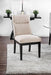 Jasmin Black/White Side Chair (2/CTN), 20 1/2"W X 27"D X 38"H, 52.4lbs. This side chair features a black finished wooden frame that highlights the bright beige upholstering for a clean two-toned appeal. The seat and tufted back offer ergonomic support and high levels of comfort. This is an orderly chair that can fit with a large variety of decors. Features: Contemporary Black Solid Wood,Wood Veneer,Others Tufted Chair Backs Tapered Legs Padded Fabric Cusions Welt Trim