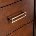 Prominently distinguish your sophisticated bedroom from everyone else's by filling the space with these refined pieces. All eyes will instantly be drawn to the diamond patterned tufting along the headboard of the bed, especially with its sleek and shiny trim, before moving on to admire the chic case goods’ unique handles and silver-finished accents. Complete with subtly angled legs and plenty of storage, this elegant set features a warm and inviting finish to complete its welcoming atmosphere.