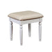 TRACY White Vanity w/ Stool, 17 1/4"L X 14 1/2"W X 17"H, 160.6lbs. Shimmering mirror inserts and an extravagant tri-fold mirror create a dramatic statement that screams glam! The paired upholstered stool and many drawers of this contemporary style vanity set create a comfortably functional place to sit and prep for the day. Features: Contemporary Style Storage Drawers 3mm Mirror Inserts 3-Sided Mirror Solid Wood, Wood Veneer, Others White