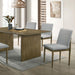 This dining set is a perfect addition to any casual dining room, with its straightforward design that will leave a lasting impression on your family and friends. The expansive tabletop is held up by unique curved legs that bend inward to support a spacious open shelf just below the apron. Sit comfortably on one of the chairs with padded seats and backs with welts--their warm beige fabric blending perfectly with the warm natural tone finish.